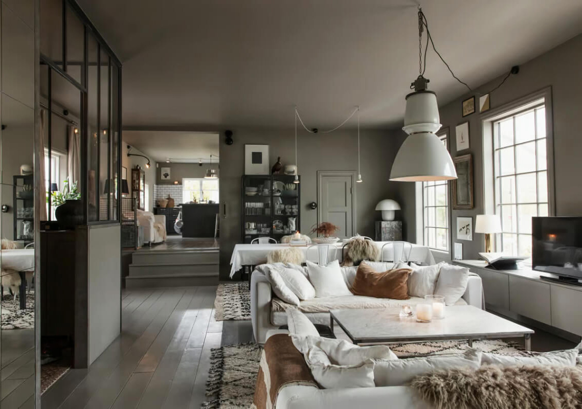 Продолговатый план и открытые пространства — эта шведская дача расположилась в довольно необычном здании. Дело в том, что раньше здесь функционировала небольшая фабрика, но позже бизнес и само строение пришли в упадок, перед тем как его выкупил частный владелец. Сейчас коттедж может похвастаться не только интересным пространством, но и довольно смелым дизайном. В его основе — полностью серая оболочка, наполненная мебелью белого цвета и элементами индустриального стиля. Enjoy!