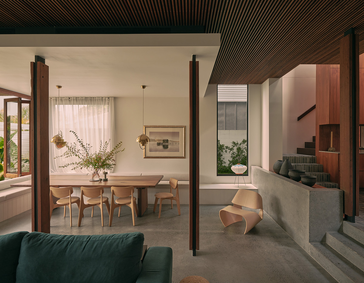 Работая над реконструкцией этого небольшого коттеджа 1926 года в Брисбене, студия Alexandra Buchanan Architecture решила сыграть на контрастирующем сочетании индустриальных материалов и деталей из натурального дерева. Так, почти во всём доме пол выполнен из микроцемента или плитка, в то время как в оформлении потолков, перегородок и корпусной мебели использовалось несколько видов натурального дерева. Несмотря на скромную площадь дома, он имеет прекрасную интеграцию с садом, а также стильный бассейн в качестве приятного бонуса.