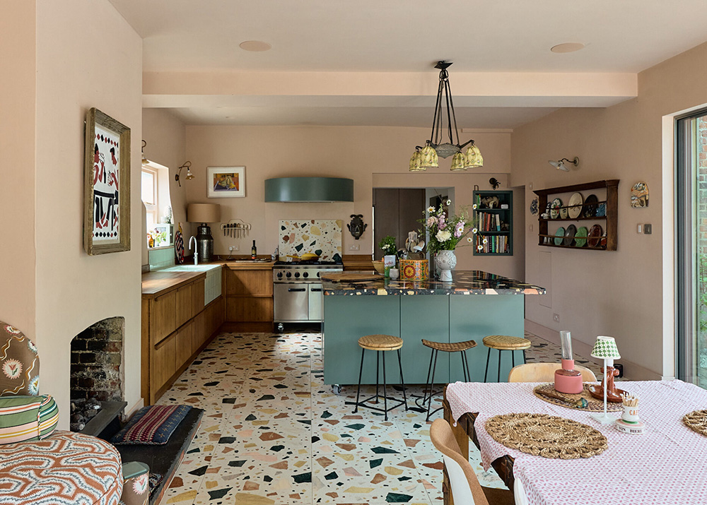 Всевозможные принты и узоры украшают комнаты этого исторического георгианскго коттеджа недалеко от Лондона. От плитки тераццо на кухне и полосатых обоев в гостиной до пёстрого текстиля и оригинальной обивки мягкой мебели — разнообразие тем и рисунков в интерьерах этого дома просто поражает воображение. А если добавить сюда ещё и пастельную гамму декора, то получим вот такой необычный и яркий интерьер!