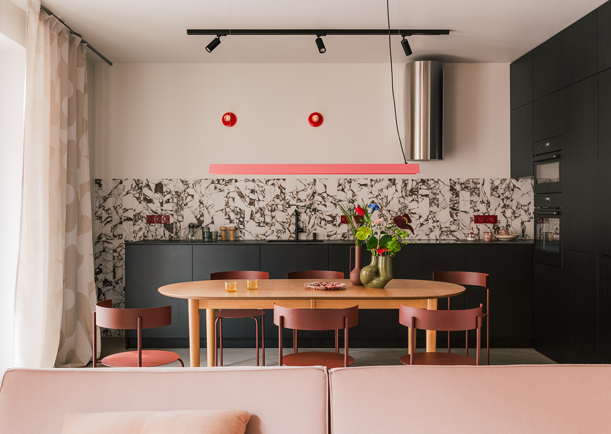 В интерьерах этой небольшой двухкомнатной квартиры в Кракове узнаётся фирменный стиль студии Mistovia. Это лёгкое современное пространство с лаконичными формами и скруглёнными углами, необычные шпонированные фасады корпусной мебели и стильные цветовые акценты в декоре. Самым эффектным местом в доме стала кухня с её минималистичными черными шкафчиками, оригинальным фартуком из мраморной плитки и лаконичным розовым светильником над рабочим столом. А ещё есть ванная комната с необычной плиткой с эффектом красивого натурального камня. Оригинальный и интересный современный дизайн!