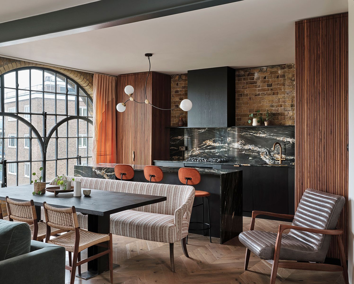 Эффектный лофт в Лондоне с кирпичными стенами и арочными окнами