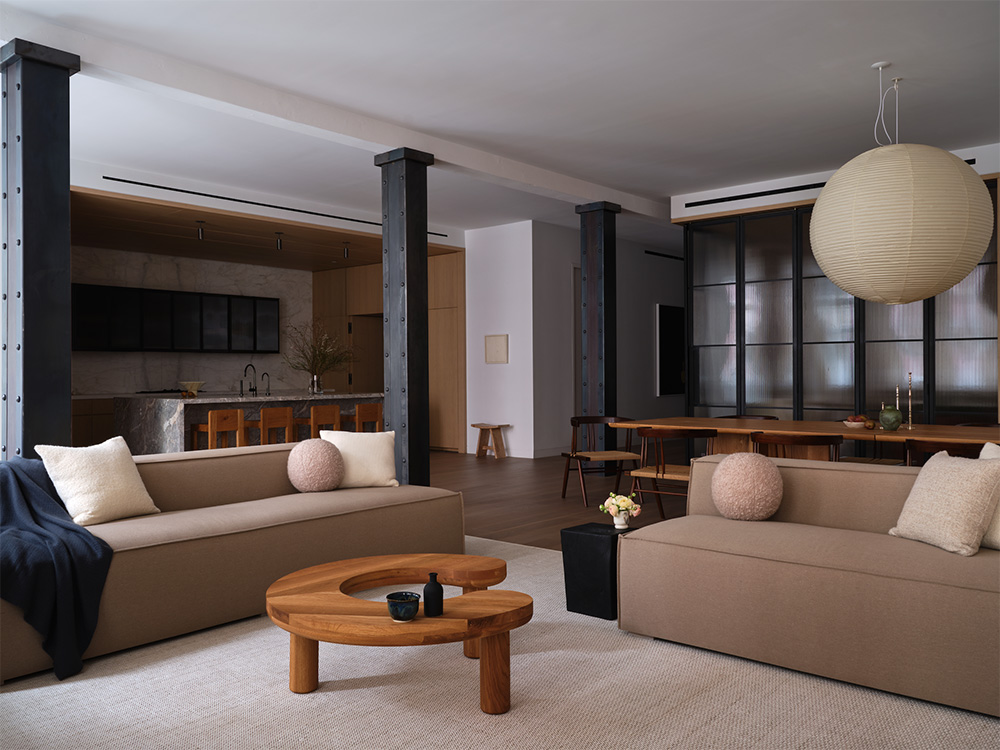 Этот прекрасный современный интерьер в Нью-Йорке построен на контрастах стилей и материалов. С одной стороны пространство: великолепная индустриальная квартира с открытой планировкой, металлическими колоннами и стеклянной перегородкой. С другой — декор, в котором доминирует элегантная современная мебель и приятные благородные материалы. Отличный дизайн от студии Christina Cole!