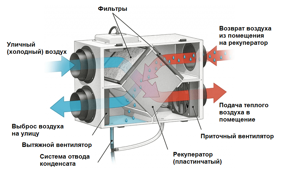 Принцип работы систем вентиляции с рекуперацией тепла: