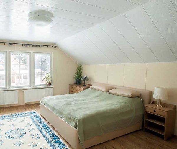Один из самых сложных вопросов — отделка потока в мансарде. Потолок в таких помещениях либо наклонный, либо ломаный. Оба варианта не слишком просты для отделки. В принципе, можно использовать любой материал, которым отделывают потолки в обычных помещениях, но монтаж должен учитывать возможность смещения несущих конструкций. Балки делают из древесины, а она изменяется в размерах при изменении температуры/влажности, так что жесткое крепление каркасов или отделочных материалов грозит возникновением трещин.