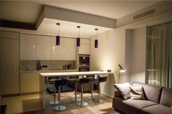 Конструкция потолка позволяет устанавливать точечные светильники, выбирая место их размещения по своему вкусу, что делает освещение на кухне более функциональным. Результат может быть очень красивым. Еще один положительный момент в том, что гипсокартон сделан из натуральных материалов — это два листа картона и прослойка гипса между ними.