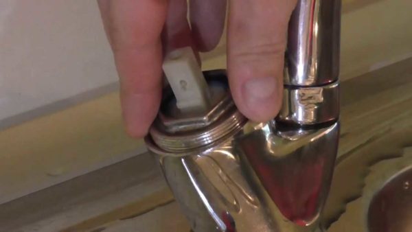 Откручиваете гайку с сеткой, которая находится на конце излива. Промываете ее, прочищаете забитые отверстия (можно иголкой или старой зубной щеткой). Прочищенную сетку устанавливаете на место.
