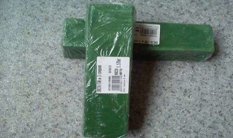 • №3. Нужен для средней шлифовки. Можно добиться мягкого ровного блеска. В составе меньше оксида хрома — 70-80%, зато больше жиров (по 10% жира и стеарина), силикагеля и керосина столько же (по 2%).
