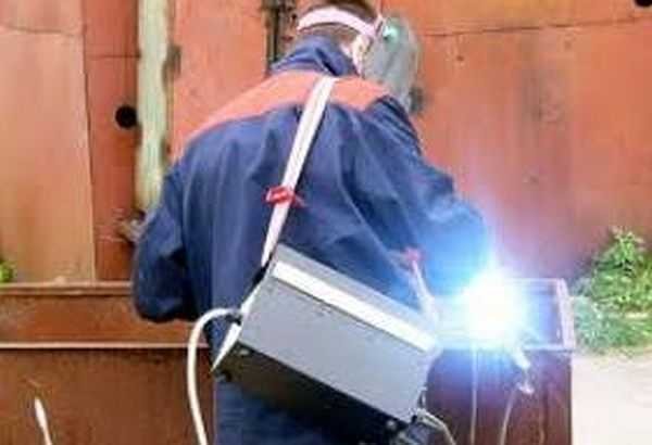 Этот аппарат представляет собой небольшой металлический ящик, который в зависимости от мощности весит от 3 кг до 6-7 кг. Корпус обычно металлический, некоторые производители делают в нем вентиляционные отверстия — для лучшего охлаждения «начинки» (большей частью — трансформатора). Для переноски есть ремень, иногда есть еще и ручка: ремень надевают на плечо, если работа требует передвижения.