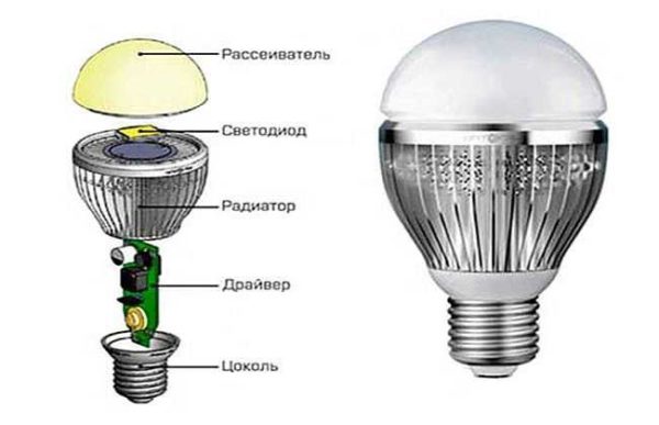 Светодиодная лампа состоит из нескольких устройств