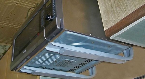 Основной плюс кронштейнов для установки микроволновой печи — их практически не видно, когда прибор на них установлен. Минус — при боковом ударе прибор может слететь. Если место выбрано «непроходное» — это не страшно. Иначе лучше выбрать полку с боковыми гранями или придумать какие-то упоры для фиксации устройства.