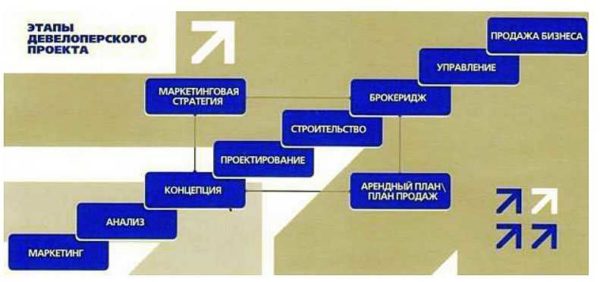 Чем же тогда девелопер отличается от застройщика? Тем, что застройщик только реализует проект — ведет непосредственно строительные работы, возможно, с привлечением средств. В то время как девелопмент предполагает полный цикл — от задумки до конечной реализации. То есть девелоперская компания занимается: