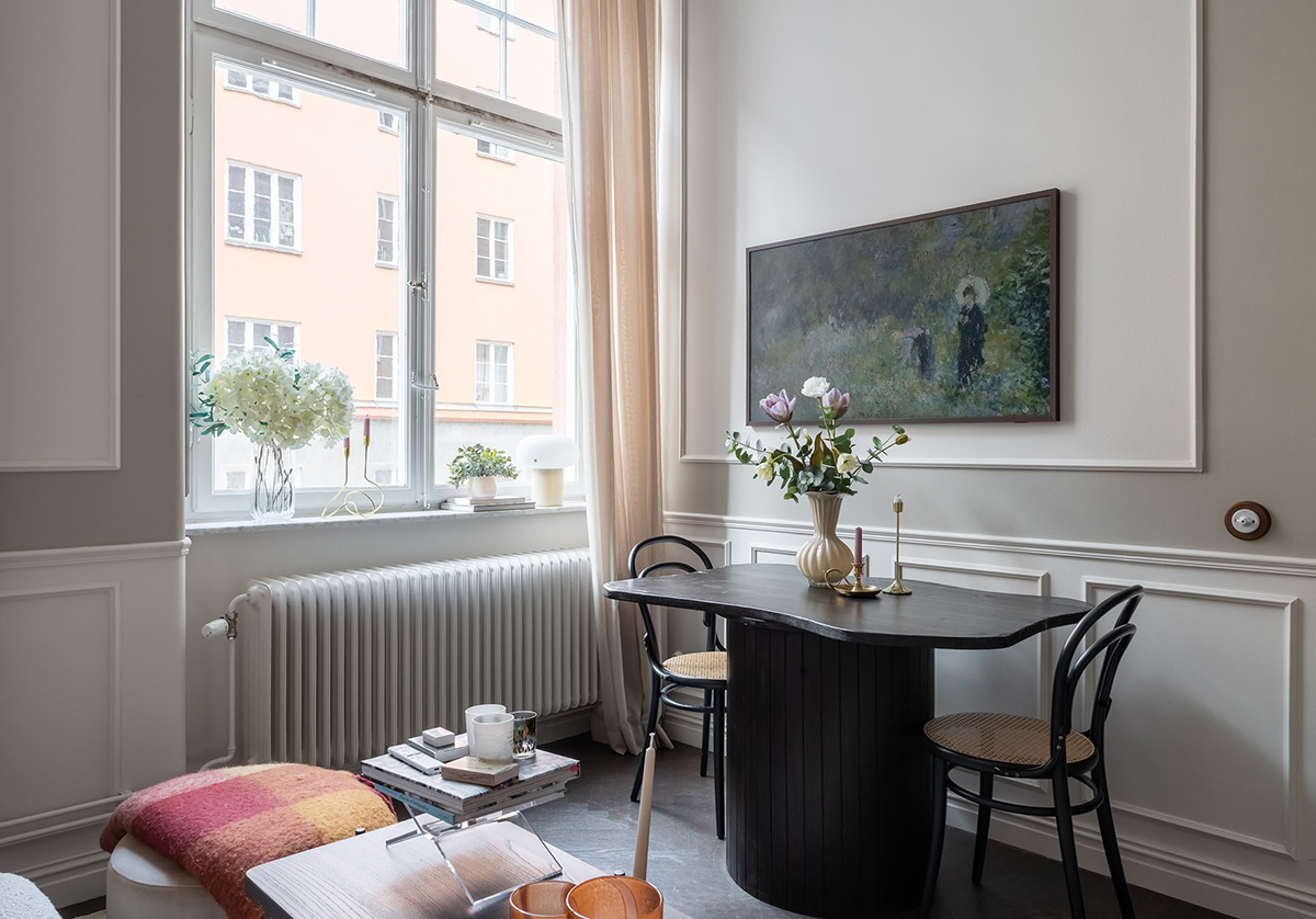 В желании сделать интерьер этой двухкомнатной квартиры в Стокгольме элегантным, дизайнеров не остановила даже его совсем маленькая площадь в 34 кв. м — молдинги украшают стены жилья, подчеркивая прекрасную высоту потолков. Лепнина на потолке, а также современное настенное искусство также добавляют интерьеру солидности. Что касается мебели и декора, то здесь авторы проекта сделали акцент на лаконичные современные образцы и сдержанную нейтральную гамму. В тесноте, но со стилем!