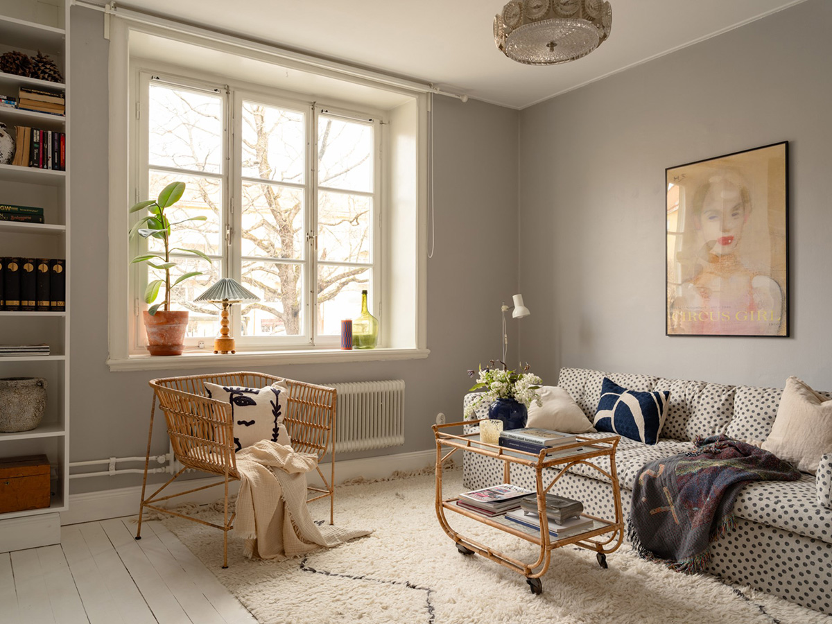 Маленькая шведская квартира с нежными интерьерами и пятнистым диваном (38 кв. м)