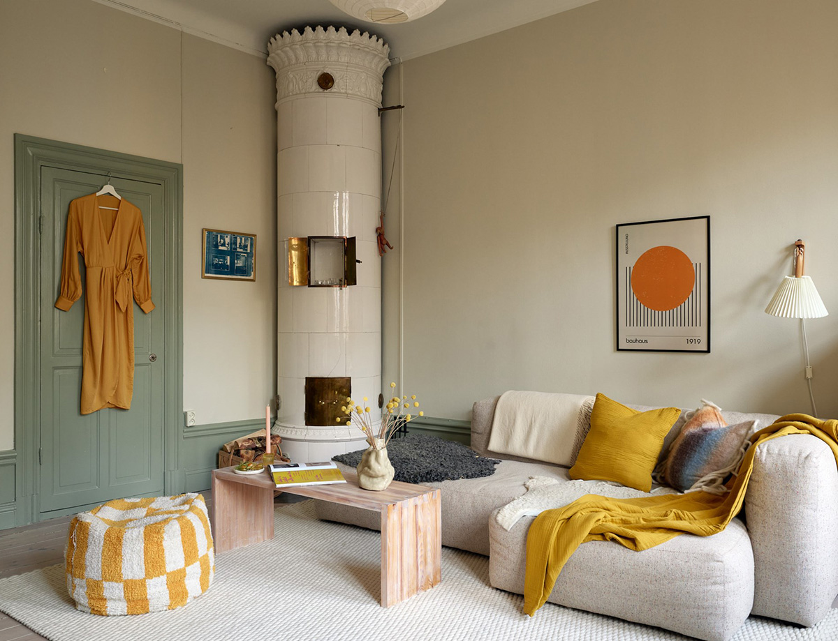 Маленькая, но интересная — несмотря на площадь этой квартиры в Стокгольме с отдельной спальней всего 41 кв. м, её интерьер выделяется в первую очередь необычной цветовой гаммой. К светлым и тёплым базовым оттенкам дизайнеры решили добавить оливковые акценты — оконные и дверные рамы, плинтусы, живые растения. Стоит сказать, что большую часть площади занимает гостиная с камином и раскладным обеденным столом, в то время как спальня и кухня получились совсем крохотными. Enjoy!