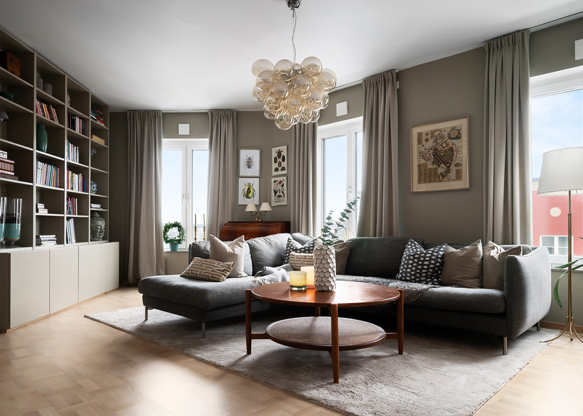 В последнее время у всех на слуху мягкий минимализм, построенный на очень светлых и почти белых тёплых натуральных тонах. Но знали ли вы, что мягкими могут быть также и тёмные оттенки? В этой шведской квартире мы видим как раз такую ситуацию — цветовая гамма состоит из оттенков тёмной палитры, но пространство всё равно ощущается мягким и располагающим. Секрет здесь простой — правильной подобранный цвет для стен и мебели, а также наличие большого количества естественного освещения. Enjoy!