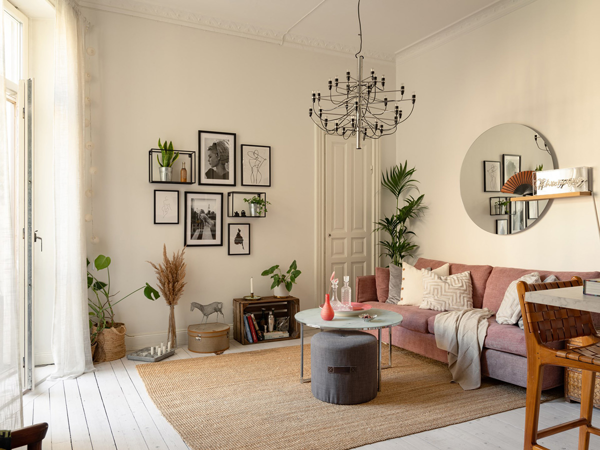 Эта небольшая двухкомнатная квартира в Стокгольме с первой фотографии очаровывает тёплой, уютной атмосферой и продуманным до мелочей интерьером. Светлые стены и пол создают ощущение простора, а мягкий розовый диван и натуральные текстуры добавляют приятных акцентов. Всё пространство наполнено светом, живыми растениями и стильными деталями — от винтажных постеров до изящных светильников. Здесь хочется остановиться, вдохнуть глубже и просто наслаждаться тишиной и спокойствием.