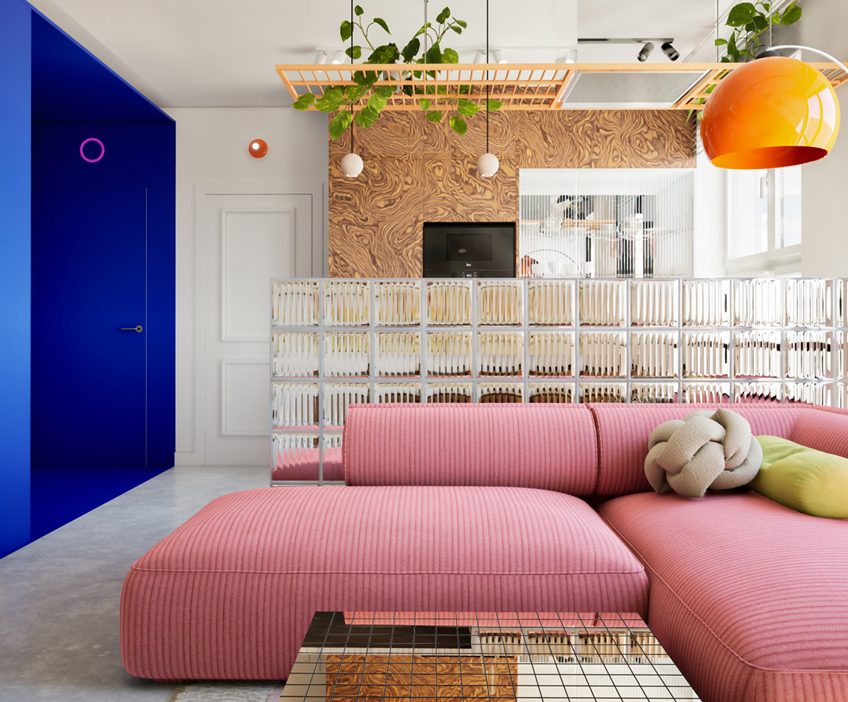 Площадь этой квартиры в Польше 79 кв. м, но они разбиты на двух уровнях, поэтому комнаты довольно небольшие. В таких условиях дизайнеры студии LOOKSFERY постарались спроектировать интерьеры максимально светлыми и открытыми, чтобы нивелировать недостаток места. Но главное в этом проекте — это интересные и смелые цветовые и текстурные акценты, которыми богата квартира. Ярко-синяя прихожая, розовый диван, оригинальные кухонные шкафчики и неоновый свет в ванной — работа дизайнера видна здесь невооруженным взглядом и этом комплимент, а не критика. Enjoy!