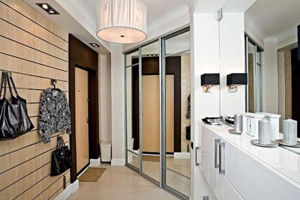 Начнем от дверей. Вот вы зашли. Вам нужно где-то поставить сумки, присесть, снять обувь, повесить одежду. Вот все это размещайте в прихожей. Первым делом — шкаф. В данном случае он занял место напротив двери. На фото — прихожая в этой квартире, взгляд со стороны кухни. Чтобы сделать помещение более светлым и объемным, дверца в шкафу напротив кухни сделана зеркальной. Она отражает свет, освещая днем лучше светильников.