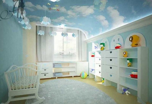 Оформление может быть не только монохромным. Используют разные цвета. Но тут необходимо быть осторожным: вам же надо чтобы потолок был фоном, а не основным объектом внимания, так что не «переборщите» с цветом.