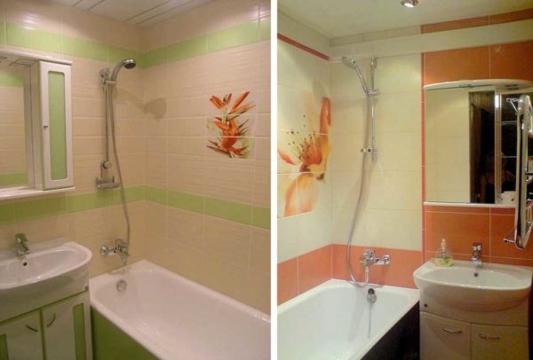 Чтобы ванная при этом не выглядела слишком уж стерильной, светлый цвет разбавляют яркими элементами. Вариантов несколько — бордюр из более темной плитки, темная нижняя часть стены (примерно — нижняя треть). Если нижняя част стены темная, пол делают того же цвета или очень близкого, если не удается найти плитку того же тона.