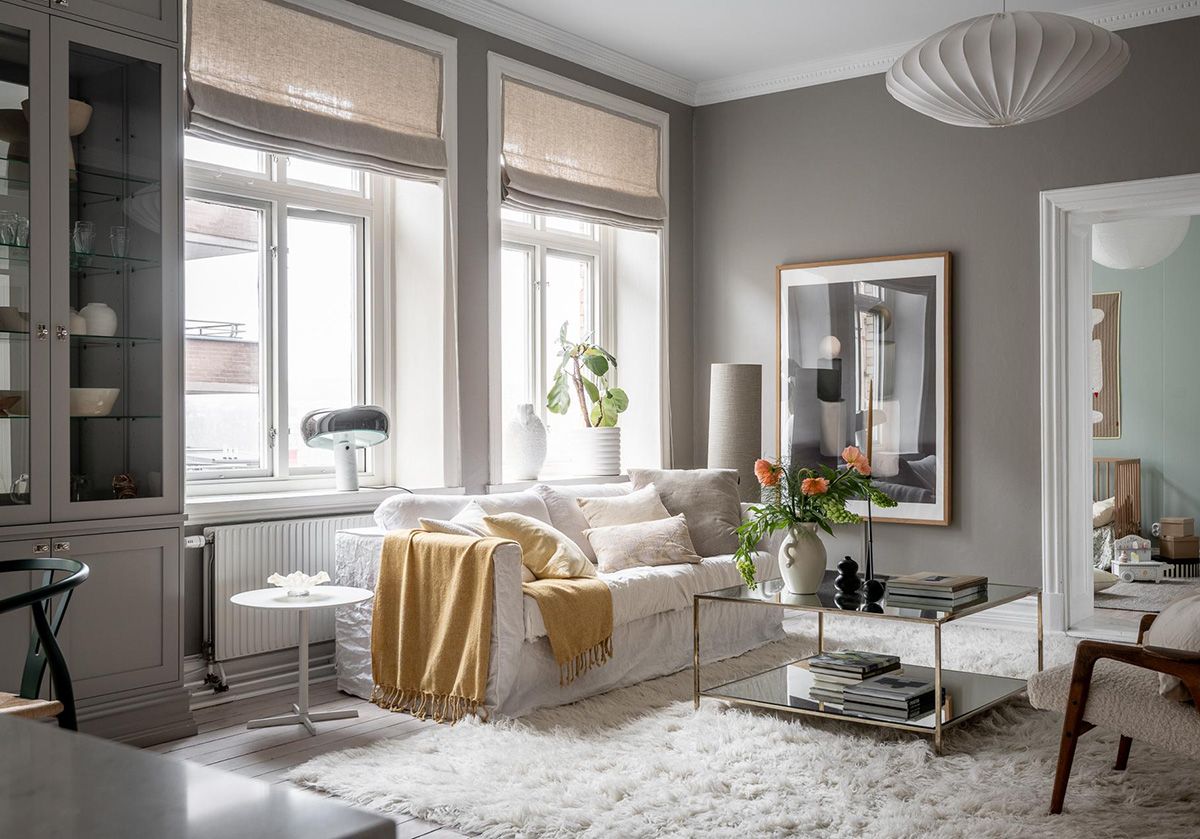 Думаете, серый интерьер — это банально и скучно? Не тут то было — эта шведская квартира выглядит довольно необычно и оригинально, несмотря на почти монохромные интерьеры. В гостиной белый диван и ковёр придают воздушности пространству, в то время как интересные кухонные фасады добавляют неожиданных ноток индустриального стиля в интерьер. Давайте же рассмотрим это пространство в деталях!