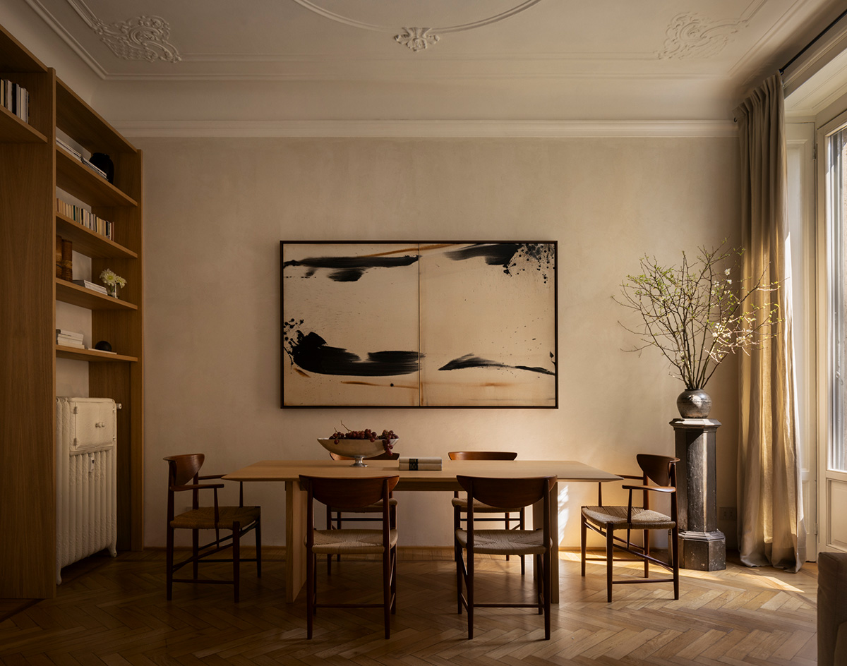 Процесс поиска жилья для молодого архитектора Maura Pinto был довольно долгим и трудным, но после всех стараний она наконец нашла именно то, что искала — квартиру в роскошном классическом доме в северо-западной части Милана. Несмотря на всё великолепие декораций фасада здания, который сочетает в себе черты нескольких архитектурных эпох, интерьеры были слишком пёстрыми и хаотичными, что не соответствовало эстетическим вкусам хозяйки. Тщательно сохранив главное богатство пространств — лепнину, паркет и классический декор — Маура дополнила интерьеры спокойной современной эстетикой с минималистичным характером и вниманием к мельчайшей детали. Красиво и изысканно!