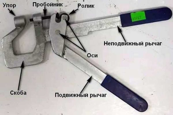 Внешне просекатель — это те же клещи, но с длинными рукоятками и непривычным строением рабочей части. Как у обычных клещей, у них есть две губки, но они разные по форме. С одной стороны упор, с другой пробойник. Пробойник — это выступающая часть, которая проделывает отверстие в металле. Упор — это утолщенная часть с отверстием, в которое заходит пробойник.