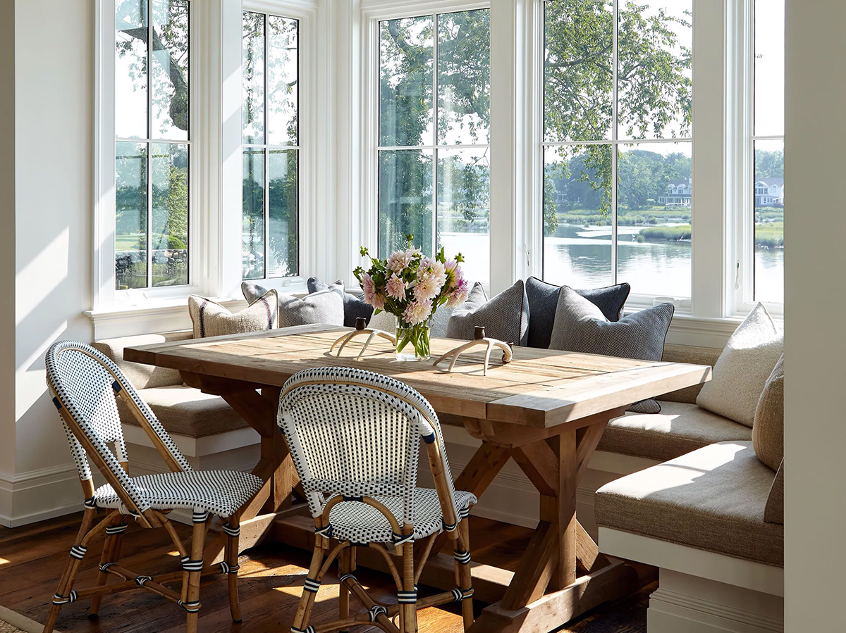 Наверное, вот так выглядит чисто американская мечта о загородном доме у озера. Это не маленькая деревянная хижина, а просторный и светлый особняк с большой кухней и открытыми интерьерами. В доме очень много окон, а с главных комнат открываются замечательные виды на природу и воду. Что касается дизайна интерьеров, то здесь мы имеет дело с уютным традицинным американскими стилем в бело-синей гамме и вставками тёплого натурального дерева. Замечательный дом!