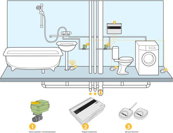 Контроль протечки воды Нептун — состав тот же: датчики, краны с электроприводами и блок управления