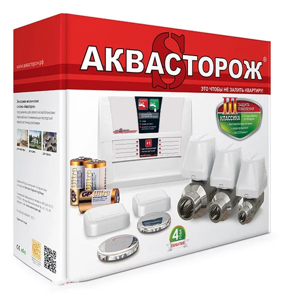 Система защиты от протечек Аквасторож может комплектоваться проводными и беспроводными датчиками. Они могут применяться как вместе, так и отдельно. Любой из датчиков периодически проверяется системой на предмет его «присутствия». В случае обнаружения обрыва провода у проводных моделей или попадания со связи беспроводных, контроллер перекрывает краны.