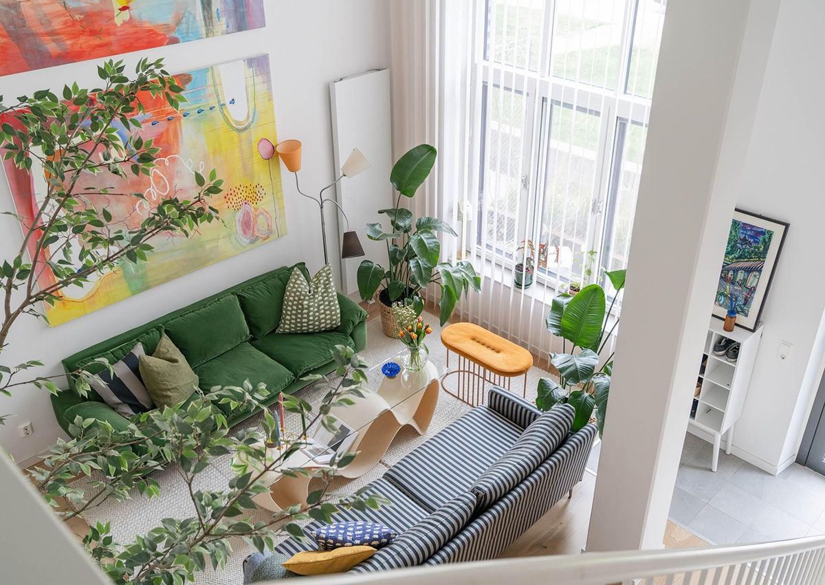 Этот современный таунхаус в Стокгольме привлекает своим впечатляющим пространством и оригинальной концепцией декора. В его просторной и светлой гостиной потолки и окна имеют двойную высоту, и вместе с открытой планировкой этот интерьер выглядит очень здорово. В декоре же преобладает зелёный — как в цветовых решениях, так и в обилии живых растений, который создаёт в этом доме атмосферу городских джунглей. Enjoy!