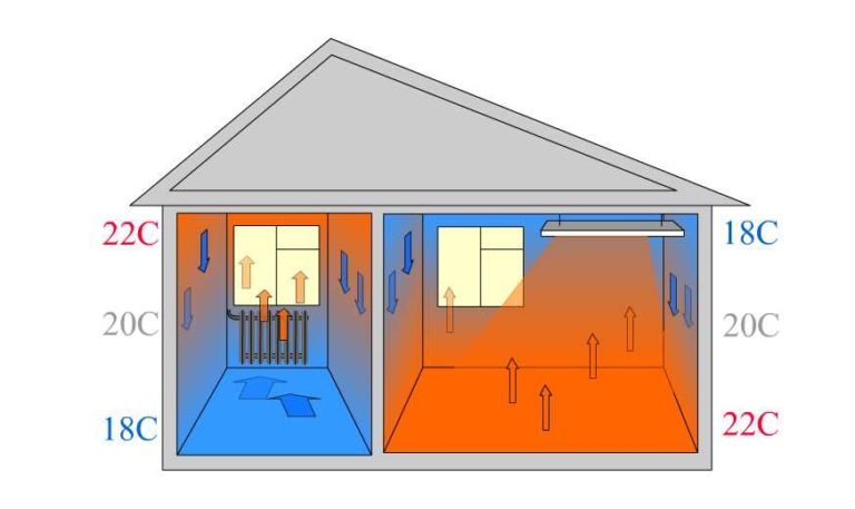 Инфракрасное (ИК) отопление действует не так, как конвекторное. От излучаемых волн нагреваются предметы — стены, пол, потолок, мебель, а уже от них нагревается воздух в помещении. Человека, находящегося в нагретом инфракрасным излучением комнате, тепло окутывает со всех сторон, и со стороны пола тоже. По этой причине уровень комфортной температуры снижается на пару-тройку градусов, а это значит, что при тех же условиях затраты на отопление будут меньше.