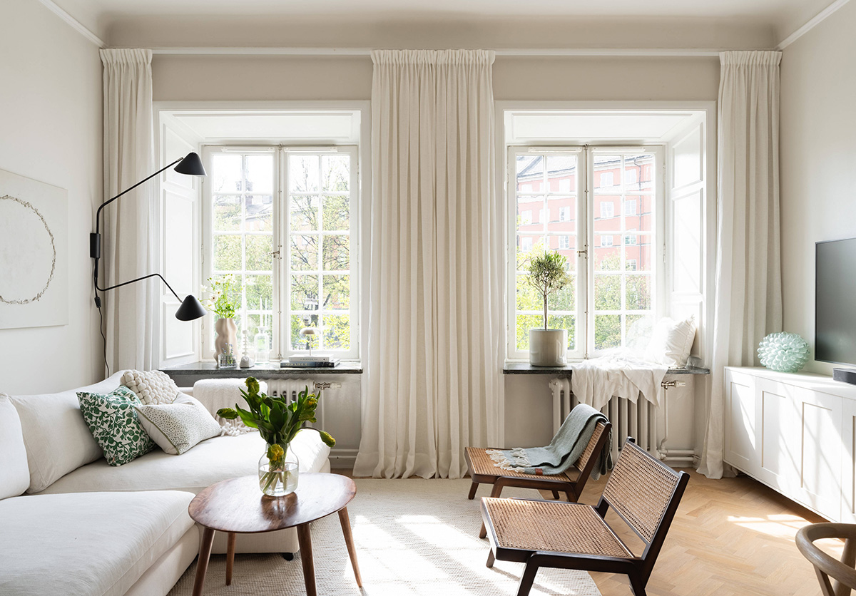 Одно из первых, что бросается в глаза при первом взгляде на интерьер этой квартиры в центре Стокгольме — это чудесные окна в гостиной с глубокими проёмами и классическим оформлением. Именно они, а точнее тот прекрасное количество естественного света, которое они пропускают внутри, и стало вдохновением для дизайна интерьеров. Пространство квартиры декорировано в лёгких и светлых оттенках с современной мебелью, утончёнными деталями и нотками искусства. Enjoy!