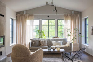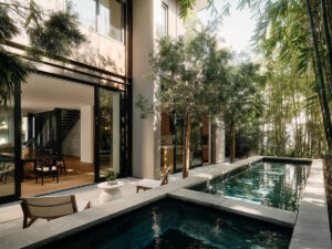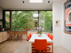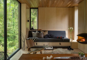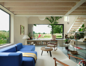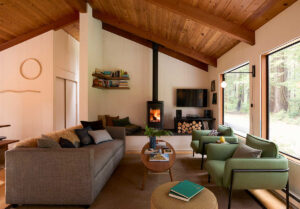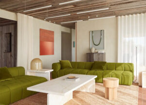 В отличие от строгого сдержанного современного экстерьера из дерева и камня, призванного слиться с суровой местной природой, интерьер этого современного летнего дома на острове Корсика получился довольно ярким и с игривыми акцентами. Основа внутреннего оформления выполнена также с использованием спокойных натуральных, а вот мебель и декор выразительно выделяются на этом фоне. Зелёный диван, современное искусство, …
