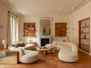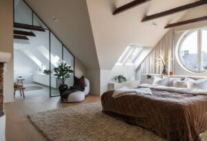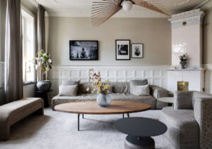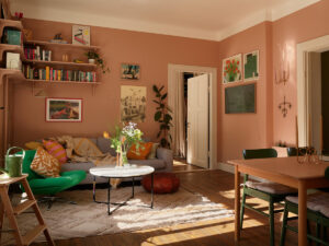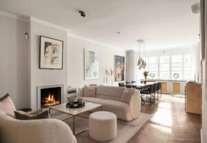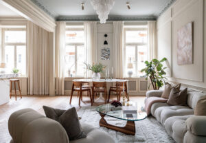 Эта прекрасная квартира расположилась на тихой и зелёной окраине Стокгольме, а с её окон открываются умиротворяющие виды на деревья. Именно близость к природе вдохновила дизайнеров на оформление интерьеров, при это они выбрали довольно необычные цветовые сочетания. Так, в гостиной очень красивый пыльно-розовый цвет стен, а в главной спальне — приятный оливковый. Ну и, конечно же, …