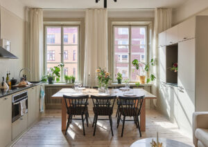 Эта шведская квартира впечатляет своими контрастами. И первый из них — это прекрасная двустворчатая дверь из гостиной в спальню из натурального дерева в деревенском стиле, которая является главным акцентом в интерьере. Также довольно смелым был выбор цвета стен в комнатах — от голубой обеденной до тёмно-серой спальни. Кроме этого, судя по настенному декора, хозяева увлекаются …