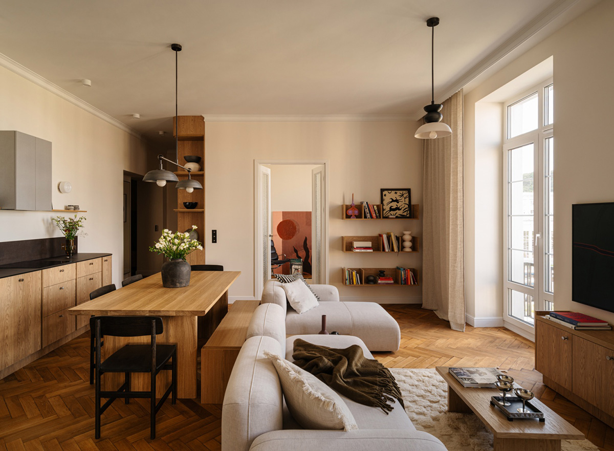 Хоть эта квартира и расположена в доме 1930-х годов в Гдыне, дизайнерам J Creative Studio удалось создать открытую современную планировку. В огромной основной комнате с высокими потолками они объединили диванную зону с лёгкой кухней без верхних шкафчиков, а также обеденной зоной. В оформлении и декоре преобладают лаконичные и скруглённые формы, а также натуральное дерево, а интересный микс современных и ретро предметов делает пространство визуально и эстетически богатым. Enjoy!