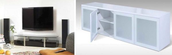 Монтируются подвесные тумбы под ТВ на мощные кронштейны. Даже несмотря на это, их не стоит нагружать большим количеством вещей. Кроме самого телеприемника можно поставить пару-тройку элементов декора, да положить несколько гаджетов.