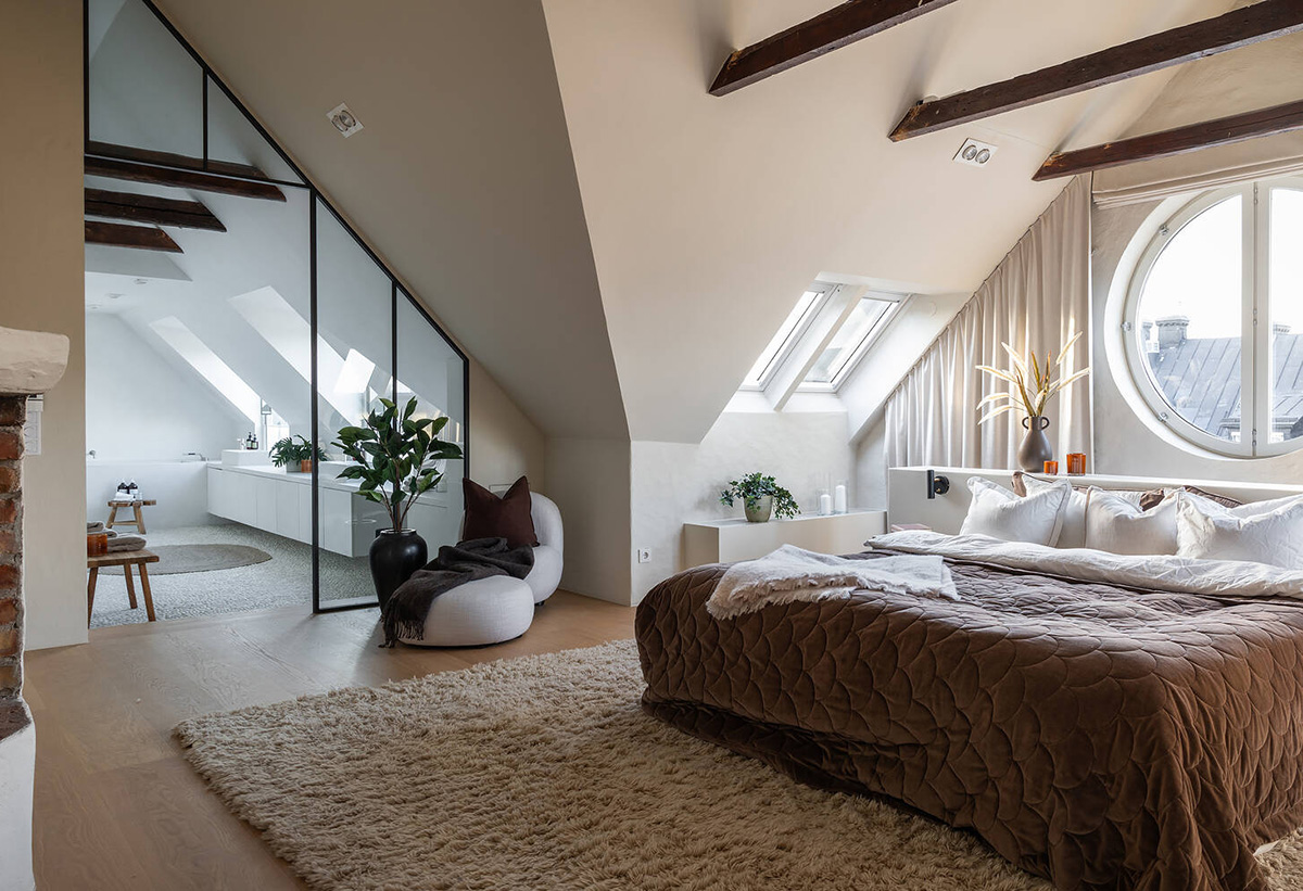 Про такие интерьеры обычно говорят «единственный в своём роде». И действительно, только представьте: чердачное помещение старого дома в центре Стокгольма, площадь более 300 кв. м, несколько камином (один из словно из французского поместья) и чудесные пространства со скошенными потолками. Эта квартира изначально представляла собой довольно уникальный объект. Шведские дизайнеры решили не убирать акцент с невероятных объемов или линии, и оформили интерьеры в спокойном натуральном, но выдержанном и уютном стиле. Давайте же рассмотрим всё в деталях!