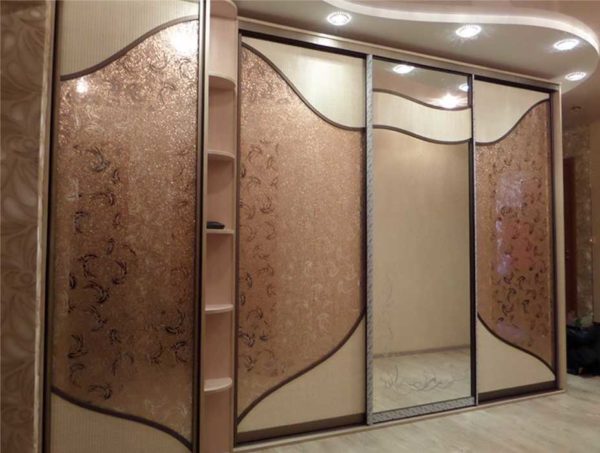 • Комбинации описанных выше материалов и технологий. Наиболее декоративный эффект получается если совместить несколько материалов. Количество комбинаций очень велико и можно подобрать фасад для углового шкафа купе под любой интерьер и вкус.