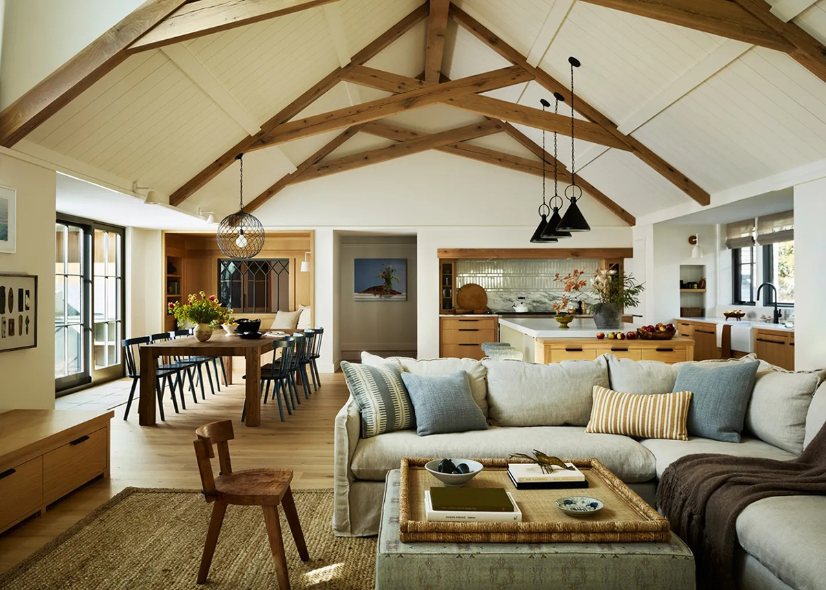 Этот загородный домик с расслабляющими интерьерами был построен всего пару лет назад, но выглядит как традиционный американский коттедж для отдыха на выходных. Строительство с ноля дало хозяева и дизайнерам ряд преимуществ — в первую очередь это возможность идеально спроектировать внутреннее пространство дома под нужды семьи, которая часто принимает гостей и устраивает вечеринки. В декоре интерьеров здесь преобладают натуральных материалы и тона, которые позволили дизайнера добиться ощущения жилья вне времени. Красота!